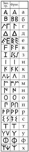 Keywords: Phrygiae.jpg West-Greek and Phrygian letters Cyrillic table Own 2007-09-14 Telamon Phrygian Greek alphabet Alphabet charts