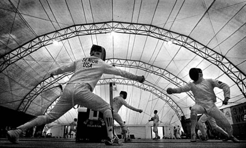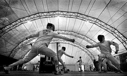 | Keywords: Pi040204d07.jpg Army 1st Lt Chad Senior competes in the Team Modern Pentathlon in the 3rd World Military Games in Catania Sicily Competitors have to compete in five events fencing shooting horseback riding running and swimming The U S team won the gold medal http //www defenselink mil/home/photoessays/2004-04/p20040402d05 html PD-USGov Fencers 2003 Military World Games Black and white photographs of fencing | ||||