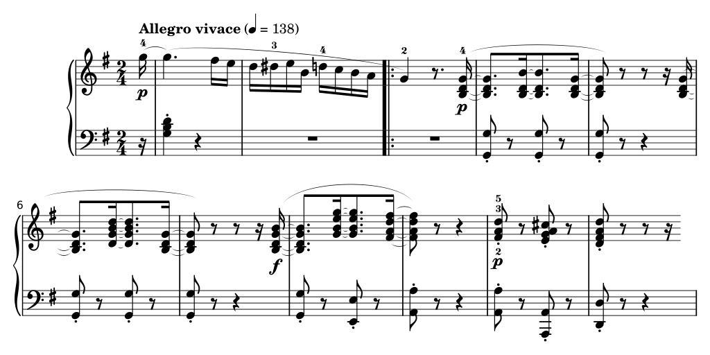 | Keywords: Piano-sonata-16-Beethoven-introduction.svg Introduction of Beethoven's piano sonata No 16 File generated from the SVG output of Lilypond with the following file <pre> \header title Piano sonata No 16 in G major Op 31 No 1 subtitle Introduction source IMSLP03169 Boston Oliver Ditson Co 1876 U S edition of J G Cotta's edition Stuttgart composer Ludwig van Beethoven 1770-1827 copyright Public Domain \version 2 12 \paper set-paper-size a4 \score \new PianoStaff << \new Staff up \relative \clef treble \key g \major \time 2/4 \tempo Allegro vivace 4 138 \partial 16 g16-4\p 1 g4 fis16 e 2 d dis-3 e b d-4 c b a \bar 3 g4-2 r8 \slurUp <b d g>16-4\p ~ 4 <b d g>8 <b d b'>16 ~ <b d b'>8 <b d g>16 ~ 5 <b d g>8 r8 r8 r16 <b d g> ~ 6 <b d g>8 <d g b d>16 ~ <d g b d>8 <b d g>16 ~ 7 <b d g>8 r r r16 <b d g b>16\f ~ 8 <b d g b>8 <g' b e g>16 ~ <g b e g>8 <fis a d fis>16 ~ 9 <fis a d fis>8 r r4 10 <fis-2 a-3 d-5>8\staccato\p r <e g a cis>\staccato r 11 <d fis a d>\staccato r r r16 12 \new Staff down \relative \clef bass \key g \major \time 2/4 r16 1 <g b d>4\staccato r4 2 R2 3 R 4 <g g'>8\staccato r <g g'>\staccato r 5 <g g'>8\staccato r r4 6 <g g'>8\staccato r <g g'>\staccato r 7 <g g'>\staccato r r4 8 <g g'>8\staccato r <e e'>\staccato r 9 <a a'>\staccato r r4 10 <a a'>8\staccato r <a a'>\staccato r 11 <d d'>\staccato r r4 12 >> </pre> Rework with Inkscape removed text and converted all objects to paths then saved as simple SVG en Introduction of Beethoven's piano sonata No 16 fr Introduction de la sonate pour piano n° 16 de Beethoven own Romainbehar 2009-10-11 GNU LilyPond images Piano sonatas by Ludwig van Beethoven |