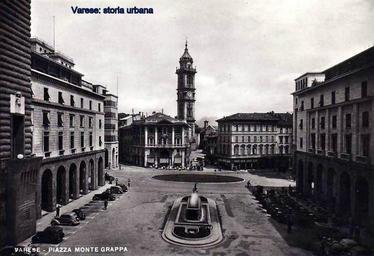| Keywords: In primo piano sulla destra palazzo Castiglioni (ing. Mario Loreti). Sullo sfondo a destra, in corso Roma (ora Moro), casa Romanò (ing. Paolo Cantù, 1889), al centro palazzo Mascardi/Pini (ing. Camillo Lucchina, 1929) e a seguire una parte del palazzo delle Generali. Tra le case svetta il campanile di S. Vittore (Giuseppe Bernascone, 1617-1774). Si notano alla base della torre littoria (ora civica) le iscrizioni cancellate con la caduta del regime fascista. varese piazzamontegrappa | ||||