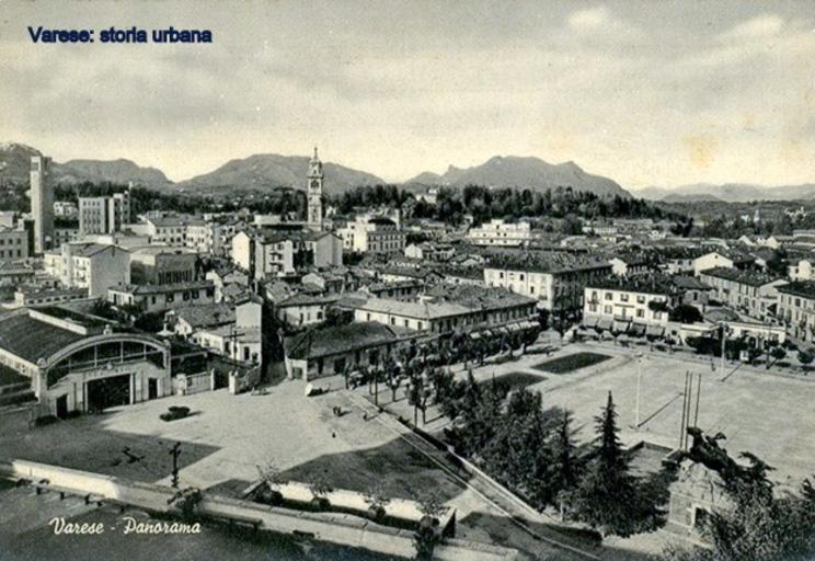 Keywords: Vista di piazza Repubblica ripresa dal collegio S. Ambrogio. A sinistra il mercato coperto (ing. Alliaud) demolito negli anni '90. All'estrema destra il monumento ai Caduti (Enrico Butti, 1925). varese