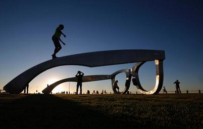 Keywords: statue sunglasses public art publicart outdoor Cape Town, South Africa Youths pose for photographs as they climb on top of a sculpture in the form of a giant pair of spectacles on Sea Point Promenade. Cape Town, South Africa Youths pose for photographs as they climb on top of a sculpture in the form of a giant pair of spectacles on Sea Point Promenade. |