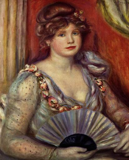 | Keywords: Pierre-Auguste Renoir 013.jpg Artwork de Dame mit Fächer Oil Canvas cm 65 54 de New York de Sammlung Durand-Ruel Yorck 1908 Creator Pierre-Auguste Renoir http //mail wikipedia org/pipermail/wikide-l/2005-April/012195 html Other versions PD-old-auto 1919 PD-Art-YorckProject 1908 paintings Décolleté in art Portraits with fans Female hair fashion in art 1908 Paintings of women by Pierre-Auguste Renoir Female necklines in art People with Curtains Females with red background Faces of women in art Females in art in three-quarter views Female arms |