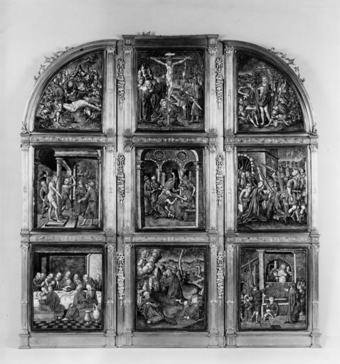 | Keywords: Pierre Veyrier II - Triptych with Scenes of the Passion of Christ - Walters 44364.jpg These nine plaques depict the Passion of Christ Beginning in the lower left a The Last Supper; b The Agony in the Garden; c Ecce Homo; d The Scourging of Christ at the Column; e The Mocking of Christ; f The Way to Cavalry; g Christ Fastened to the Cross; h The Crucifixion; i The Resurrection All are copied from engravings after Albrecht Dürer's woodcuts of the 'Little Passion' 1511 or after their copies by Marcantonio Raimondi B XIV pp 401-4 respectively nos 592 594 603 601 602 605 607 608 613 The order of c d and e has been interchanged The composition of d reverses that of the model ca 1528 1558 technique painted enamel copper Overall cm 63 59 5 accession number 44 364 14739 Dmitri Schevitch Madrid date and mode of acquisition unknown Sale Paris April 4-7 1906 lot 225 Arnold Seligmann Rey Co New York date and mode of acquisition unknown Henry Walters city Baltimore Walters Art Museum Henry Walters Acquired by Henry Walters 1919 place of origin Limoges France Walters Art Museum license Limoges painted enamels in the Walters Art Museum Pierre II Veyrier Media contributed by the Walters Art Museum needs category review Painted enamel art in the Walters Art Museum |