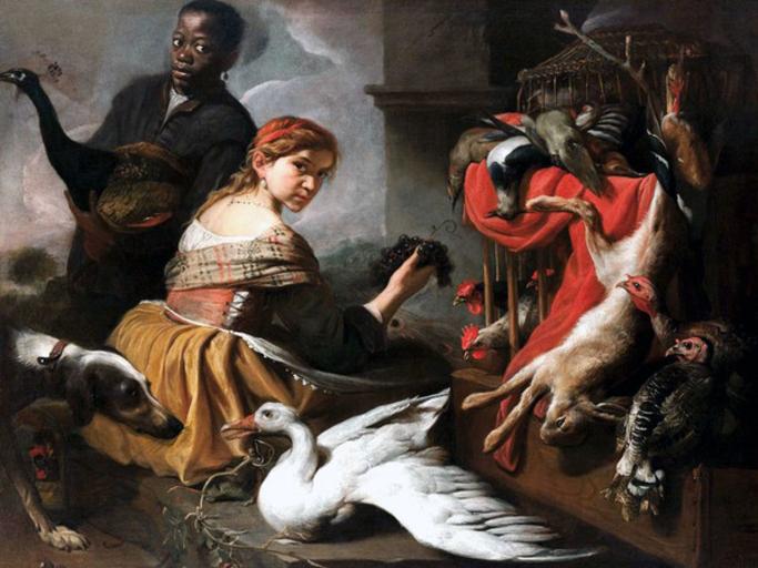 Keywords: Pieter Boel - Moor with a peacock, young woman with grapes and dead game.jpg Artwork Creator Pieter Boel between 1650 1674 Oil on canvas size cm 135 172 Institution Private collection object history credit line accession number http //www arte it/foto/il-cibo-nell-arte-capolavori-dei-grandi-maestri-dal-seicento-a-warhol-207/5 PD-old-100 Pieter Boel 1669 paintings Oil paintings of birds 1670 paintings 1671 paintings Oil paintings of animals 17th-century paintings of animals Paintings of moors Dead hares in art |