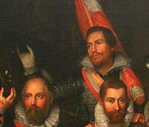 Keywords: Pieter Ramp - detail of Cloveniers 1615-1618 by Cornelis Engelsz.jpg en Portrait of Pieter Ramp in The Banquet of the officers of the Saint Adrian Civic guard in Haarlem in 1618 detail nl Portret van Pieter Ramp in Officieren van de Kloveniersdoelen Haarlem 1618 detail File Cornelis_Engelsz_-_Cloveniers_1615-1618 jpg creator Cornelis Engelsz 1618 Oil on canvas cm 171 247 5 Institution Frans Hals Museum accession number OS I-78 PD-Art-100 The Banquet of the Officers of the St Adrian Militia Company in 1618 Details of paintings by Cornelis Engelsz |