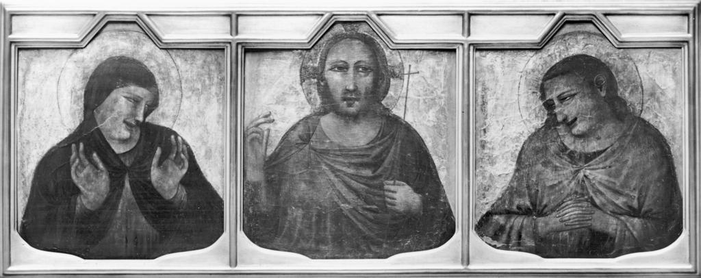 | Keywords: Pietro da Rimini - The Blessing Christ, the Mourning Virgin, the Mourning St John the Evangelist - Walters 37634.jpg Walters Art Museum artwork Creator Pietro da Rimini These fragments originally adorned a monumental crucifix The Blessing Christ would have appeared at the top while Mary and John the Evangelist would have occupied the left and right ends of the cross's horizontal beam Pietro da Rimini imitated the naturalistic figural style of Giotto the famed Florentine painter but also excelled at combining dazzling colors and stylized expressions for dramatic effect The exaggerated facial features of Pietro da Rimini's figures ensured that their expressions would be comprehensible even when suspended high above the floor In a recent innovation that demanded the worshiper's imagination the open mouths of Mary and St John suggest the sound of their lamentation For more information on these fragments please see Zeri catalogue number 36 pp 60-61 between 1340 1349 Medieval tempera tooled gold panel Christ painted surface cm 45 3 41 2 3 8 ; The Virgin painted surface cm 43 7 40 3 2 ; St John painted surface cm 45 4 40 2 3 8 Overall cm 45 24 41 12 accession number 37 634 22647 Don Marcello Massarenti Collection Rome date and mode of acquisition unknown 1881 catalogue no 6 7 and 8 as Cimabue 1897 catalogue no 39 as Giotto Henry Walters city Baltimore Walters Art Museum Henry Walters Acquired by Henry Walters with the Massarenti Collection 1902 place of origin Rimini Italy Walters Art Museum license 3D Medieval art in the Walters Art Museum Pietro da Rimini Paintings in the Walters Art Museum Media contributed by the Walters Art Museum needs category review |