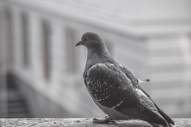 Keywords: pigeon bird balcony animal black and white city perched looking wings feathers