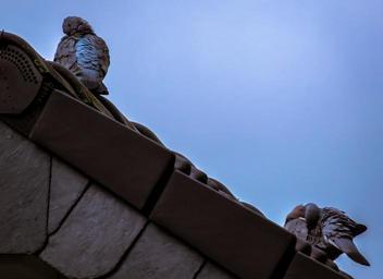 Keywords: pigeons clean plumage roof gable sky home building tile roof shingles birds
