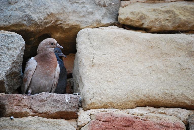 Keywords: pigeons pair birds nature whisper sweet nothings affection lovers bird pigeon poultry love romantic feelings luck tenderness heart relationship atmosphere stones wall couple mood romance cave security
