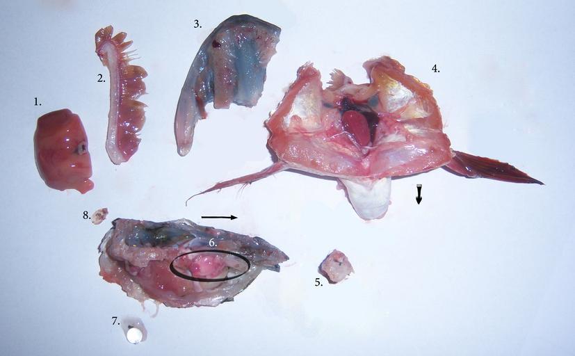 | Keywords: Pike head anathomy.jpg These are separated inner body parts of pike's head 1/liver 2/gill arch 3/palate with sharp teeth 4/in the middle a heart 5/fragment of spinal cord 6/brain 7/spherical lens 8/scale Own 2007-10-26 Gammazoni to ptp kru Fish anatomy Esox |