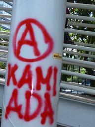 | Keywords: Pillar with graffiti, Jakarta, Indonesia - 20070501.jpg A pillar spray-painted in red with an A in a circle and the words KAMI ADA we have during a demonstration in w Jakarta Indonesia The A in a circle is a well-known anarchist symbolism Circle-A anarchist symbol Own 2007-05-01 11 09 HarisX 1st of May in Indonesia Anarchism graffiti Files by HarisX Graffiti in Indonesia Jakarta Protest marches in Indonesia Circle-A symbols | ||||