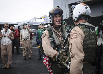 Keywords: Pilots complete 1,000th trap aboard USS Nimitz. (9623226700).jpg GULF OF OMAN Aug 28 2013 Capt Rob Osterhoudt deputy commander of Carrier Air Wing CVW 11 left and Cmdr Robert Loughran commanding officer of the Argonauts of Strike Fighter Squadron VFA 147 congratulate each other aboard the aircraft carrier USS Nimitz CVN 68 upon each completing their 1 000th carrier arrested landing or trap The Nimitz Carrier Strike Group is deployed to the U S 5th Fleet area of responsibility conducting maritime security operations theater security cooperation efforts and support missions for Operation Enduring Freedom U S Navy photo by Mass Communication Specialist 2nd Class Ryan J Mayes/Released 130828-N-RC246-436 Join the conversation http //www facebook com/USNavy www facebook com/USNavy http //www twitter com/USNavy www twitter com/USNavy http //navylive dodlive mil navylive dodlive mil http //www flickr com/photos/usnavy/9623226700/ Pilots complete 1 000th trap aboard USS Nimitz 2013-08-28 03 21 http //www flickr com/people/56594044 N06 Official U S Navy Page from United States of America MC2 Ryan J Mayes/U S Navy Attribution License XMP-photoshop Instructions Navy Visual News Service PD-USGov-Military-Navy Official U S Navy Imagery http //flickr com/photos/56594044 N06/9623226700 2014-04-03 12 50 21 cc-by-2 0 Images from US Navy location Gulf of Oman Naval officers of the United States USS Nimitz CVN-68 flight deck Files uploaded by Russavia Files uploaded by Russavia Strike Fighter Squadron 147 United States Navy Robert R Osterhoudt