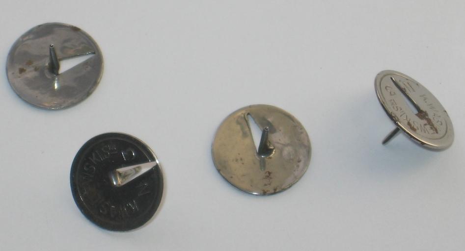 | Keywords: Pinezki-K.WasilewskiSka.jpg Thumbtacks manufactured by the company K Wasilewski S-ka in 1930's using the simplest way each detail emmbossed and cut out from tinware Pinezki wyprodukowane w latach 1930 przez firmę K Wasilewski i S-ka przy użyciu najprostszej technologii przez wytłaczanie i wykrawanie z blachy 2006-11-02 own assumed Julo Metal-only pushpins Flat pushpins Multiple pushpins Pushpins in white background Tin objects | ||||
