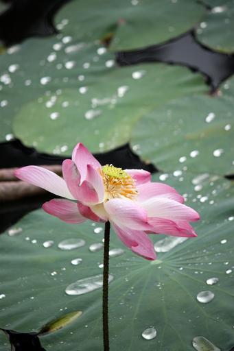 Keywords: pink lotus flowers blooms blossoms blooming aquatic water plants flowering floating green leaves round leafy dew droplets fresh wet decorative ornamental gardens gardening bright sunny