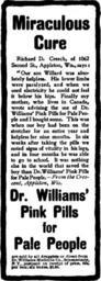 Keywords: Pink pills for pale people.png Miraculous Cure Advertisement for Dr Williams' Pink Pills for Pale People an old patent medicine PNG 867×2410 1-bit black-and-white Originally uploaded by by Smerdis of Tlön; recompressed by Closeapple using PNGOUT Text Miraculous Cure Richard D Creech of 1062 Second St Appleton Wis says Our son Willard was abosolutely helpless His lower limbs were paralyzed and when we used electricity he could not feel it below his hips Finally my mother who lives in Canada wrote advising the use of Dr Williams' Pink Pills for Pale People and I bought some of those This was when our boy had been on the stretcher for an entire year and helpless for nine months In six weeks after taking the pills we noted signs of vitality in his legs and in four months he was able to go to school It was nothing else in the world that saved the boy than Dr Williams' Pink Pills for Pale People From the Crescent Appleton Wis Dr Williams' Pink Pills for Pale People are sold by all druggists or direct from Dr Williams Medicine Co Schenectady N Y postpaid on receipt of price 50c per box; six boxes 2 50 PD-old Patent medicine advertising Text advertisements