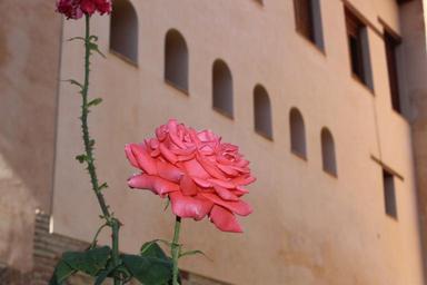 Keywords: pink roses flowers blossoms blooms blooming flowering plants floral gardens gardening yards growing growth buildings background houses residential property residence housing architecture