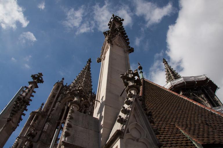 Keywords: pinnacles stone chiseled slim pointed turret gothic architecture superelevation buttresses aesthetic function static construction weight stabilize achteckiger shank leib tracery ornament middle section finial cornice crabs pyramidal peak east tower main tower münster ulm cathedral building church ulm city