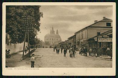 Keywords: Pinsk, Vialikaja. Пінск, Вялікая (1916).jpg Пінск Pinsk вуліца Вялікая vulica Vialikaja Спаская / Ф анцішканская Spaskaja / Franciškanskaja Biblioteka Narodowa Poczt 17760 author 1916 PD-old-70 History of Pinsk