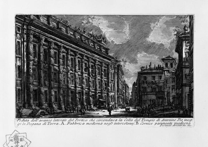 | Keywords: Piranesi-1020.jpg 1 1019 1021 XIII Veduta dell'avanzo laterale del Portico che circondava la Cella del Tempio di Antonino Pio inoggi la Dogana di Terra 53 9 x 41 3 cm en Temple of Hadrian Tempio di Antonino Pio A Fabbrica moderna negl'intercolonnj B Cornice parimente moderna <gallery> File Hadrianeum dr by Alo Giovannoli-1615 jpg 1615 File Temple of Hadrian Rome jpg 2008 </gallery> Ancient Roman buildings in Rome in art 1756 Black and white drawings Etchings by Giovanni Battista Piranesi Temple of Hadrian Rome - historical images 1756 |