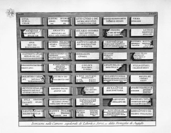 Keywords: Piranesi-3034.jpg 3 3033 3035 XXXIV fr Plusieurs inscriptions romaines Première colonne de haut en bas Livia / Lydi l iberta / Chloe CIL 06 4166 ; --- Hedistae / ---us Liviae / --- Musae lib ertus 06 4131 06 33069 AE 1992 +00092 ; Auge / dat oll am / M arco Livio Marsico 06 4102 ; Diadumenus Liviae / mensor dec urio dat / Lochiadi Liviae sarcinatr ici coniugi suae 06 3988 ; Mima l ibertus Maronia nus / dat / Meropi Ti beri et Aug ustae l iberto / Demosth eniano vir o fil iae suae // Timotheo Aug ustae l iberto / Maron iano filio suo 06 4173 ; Amaranthus C ai Caesaris --- / Aug usti dat olla m --- / Valeriae Eglogiae --- 06 4094 ; Secundio Iuliae Aug ustae / aquarius dat olla m / Advenae coniugi piae 06 3936 ; Hyla / Callisti / dec urio // Stratonice / Hylaes 06 4063 ; Faustus Liviae Tert ianus / Haline Tertii lib erta 06 3934 AE 1992 +00092 Deuxième colonne de haut en bas M arci Antoni / Ismari / dec urionis // Antoniae / Thymele / dec urionis 06 4056 ; Amiantus / Augustae l ibertus arcar ius / is dat Chio Homeri fratri --- 06 3937 ; Parthenio / Liviae l ibertus / cubic ularius // Philargyrus / Parthenionis l ibertus / Parthenio ni patr ono / ollam dat 06 3960 ; Lucifer v ixit a nnum I et d ies XLV / Hesper v ixit a nnos II / Callistus / v ixit a nnos XII / Protogenes Caesar is aurif ex fili i s suis / donat Ti berius Iulius Ireno dec urio 06 3950 ; M arcus Iulius August ae l ibertus / Agathopus / aurifex dat / Iuliae Restitutae / Iuliae Vitali / Iulio Felic i 06 3946 ; ---lius Eros dec urio / ---assa Erotis dec urio 06 4060 ; Daphno Palmi / August i lib erto 06 4117 ; M arcus Iunius Dexter dedit ollas II / Sex to Pompeio Iucundo / Pompeia Doris vix it an nos VIIII 06 4153 ; M arcus Livius / Aug ustae l ibertus / Phryx a veste // Ti beri Claudi / Phasidis / imm unis 06 4042 Troisième colonne de haut en bas Litto Liviae l ibertus dec urio / dat Macariae Liv i ae / l ibertae coniugi suae piae 06 4072 AE 1992 +00092 ; Hilario Isidori l ibertus / dat Secundae / Liviae l ibertae coniugi 06 4136 ; Agrypnus Caesar is / Aug usti Maecenatian us / a statuis 06 4032 ; Hermaiscus / Liviae l ibertus 06 4134 ; C aio Iulio / Plocami l iberto / Euhodo 06 4142 ; M arci Iuli Secundi / medici ocu larii / in fr onte p edes XIIII / in agr o p edes XIIII 06 9607 CIL V 00429 054 Gummerus-01 00108 ; Mettiae / ---ulchae Aniceti / decurioni 06 4075 ; Damalis Liviae / sarcinatrix dat / Alexandro / viro suo ollam 06 4029 ; Romulo / dec urioni Abas/canti / fratri // Cottiae / Nic a e dat / Romulus / dec urio 06 4080 Quatrième colonne de haut en bas M arcus Livius Silvanus decur io / Thymele Silvani 06 4073 ; ---s pedisequus --- / ---an dec urio et dat --- / ---tusae coniugi -- 06 4007 ; <c G>eleuthi Liviae / marg aritarii dat Dionysio / patri suo Megiste Celeuthi / mater 06 3981 ; Paschus / Amaranti / supra / cubicular ium 06 3955 ; C aius Iulius Felix dec urio / Bassa Felicis 06 4067 ; Philadelpus / Neronis Caesar is / ex horreis Petronian is / dec urio // Niphas / Philadespoti / contuber nalis / eius 06 3971 ; Anna Liviae / Maecenatiana 06 4095 ; Hilarus Liviae l ibertus / Cornelianus dec urio 06 4062 ; Altes Liviae lib ertus <<ped isequus >> dec urio dat Liviae Eleutheridi sorori et / Liviae Ceriali fil iae eius oll am I / C aio Iulio Augusti l iberto Thoanti fratri / ollam I 06 4053 Cinquième colonne de haut en as Firma / Aphrodisi 06 4128 ; Liciniae / Dionysiae / Apolloni 06 4157 ; M arcus Livius Aug ustae l ibertus / Menophilus / calciator // M arcus Livius Aug ustae l ibertus / Menophilus calc iator / ollam dat / Liviae Chloe l ibertae suae 06 3939 D 07548 ; Ti beri Claudi Festi / immunis et / Ti beri Cl audi Ponti Festi f ilii / immunis 06 4085 06 33066 ; Sylla Liviae l ibertus / Celado f ilio dedit 06 4192 ; M arcus Iulius Aug ustae / l ibertus Ismarus / a manu 06 3980 AE 1992 +00092 ; Livia Secunda / Aciri soror // Felix Caesaris / ser vus Ingenu/in us a regio/nibus urb is 06 4022 ; Heliodoro Aug usti l iberto tabulario / Panerotiano hon orato et / Antoniae Mystiche coniugi 06 4037 ; Dama Liviae l ibertus Cas--- / Phoebus Philologi --- 06 4116 Ancient Roman inscriptions in Rome CIL VI 004166 CIL VI 004131 CIL VI 033069 CIL VI 004102 CIL VI 003988 CIL VI 004094 CIL VI 003936 CIL VI 004063 CIL VI 003934 CIL VI 004056 CIL VI 003937 CIL VI 003960 CIL VI 003950 CIL VI 003946 CIL VI 004060 CIL VI 004117 CIL VI 004153 CIL VI 004042 CIL VI 004072 CIL VI 004136 CIL VI 004032 CIL VI 004134 CIL VI 004142 CIL VI 009607 CIL VI 004075 CIL VI 004029 CIL VI 004080 CIL VI 004073 CIL VI 004007 CIL VI 003981 CIL VI 003955 CIL VI 004067 CIL VI 003971 CIL VI 004095 CIL VI 004062 CIL VI 004053 CIL VI 004128 CIL VI 004157 CIL VI 003939 CIL VI 004085 CIL VI 033066 CIL VI 004192 CIL VI 003980 CIL VI 004022 CIL VI 004037 CIL VI 004116 |