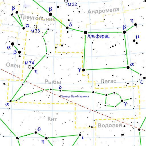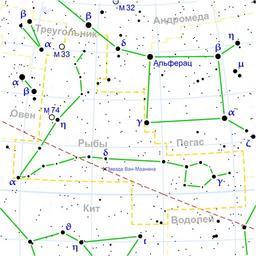 Keywords: Pisces constellation map ru lite.png en Pisces constellation map in Russian ru Ка та созвездия Рыб на усском языке It was created using the programs PP3 Miktex 2 5 GhostScript and Gimp At http //pp3 sourceforge net PP3's homepage you also get the input scripts necessary for re-compiling the map The yellow dashed lines are constellation boundaries the red dashed line is the ecliptic and the shades of blue show Milky Way areas of different brightness The map contains all Messier objects except for colliding ones The underlying database contains all stars brighter than 6 5 All coordinates refer to equinox 2000 0 The map is calculated with the equidistant azimuthal projection the zenith being in the center of the image The north pole is to the top The horizontal lines of equal declination are drawn for 0° +10° +20° etc The lines of equal rectascension are drawn for all 24 hours Towards the rim there is a very slight magnification and distortion Own 2007-02-20 Anton Gutsunaev Constellations maps russian |