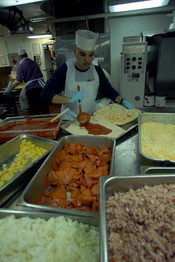 | Keywords: Pizza Night Aboard USS Ronald Reagan DVIDS119078.jpg en Operation specialist Petty Officer 2nd Class Marvyn Moreno makes pizzas for a Pizza Night aboard the Nimitz-class aircraft carrier USS Ronald Reagan Pizza Night and Ice Cream Socials are a way for the supply department to give something special to the crew and to break the daily monotony of shipboard life Ronald Reagan is deployed to the U S 5th Fleet area of responsibility 2008-09-26 Petty Officer 2nd Class Gary Prill https //www dvidshub net/image/119078 080926-N-+++++-035 2008-09-30 02 43 GULF OF OMAN USCENTCOM AT SEA PD-USGov-Military-Navy Food preparation aboard USS Ronald Reagan CVN-76 Images from DoD uploaded by Fæ |
