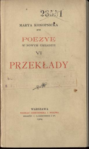 Keywords: PL Marya Konopnicka-Poezye w nowym układzie VI Przekłady 005.jpeg en book pl książka http //polona pl/dlibra/doccontent2 id 8802 Cyfrowa Biblioteka Narodowa Creator Maria Konopnicka Poezye w nowym układzie Przekłady Series title VI Gebethner i Wolff W L Anczyc i Spółka 1904 Warsaw pl PD-old-100 Poezye w nowym układzie Tom VI Przekłady |