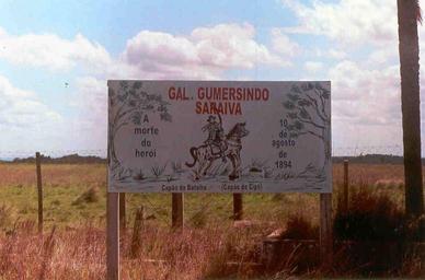 Keywords: Placa em Homenagem ao Gal. Gumersindo Saraiva - Capão do Cipó - RS.jpg Pt Placas Colocadas no marco do Capão da Batalha para homenagear o líder Maragato Gal Gumersindo Saraiva Uma delas é do município de Capão do Cipó e outra do Partido Nacional Eu mesmo fiz - Fotografia de Cássio Kurtz Bandeira Cássio Kurtz Bandeira Fevereiro de 2009 Federalist revolution in Brazil |