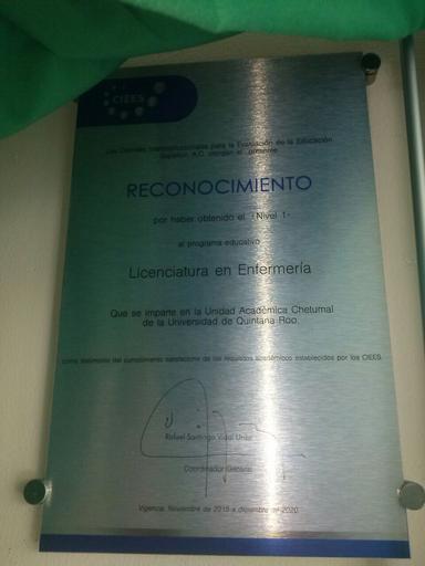 | Keywords: Placa Enfermería CIEES DCS UQROO.jpg es Placa conmemorativa de acreditación Nivel 1 otorgada a la carrera de Enfermería de la División de Ciencias de la Salud Universidad de Quintana Roo por los Comités Interinstitucionales para la Evaluación de la Educación Superior A C CIEES en Commemorative plaque of Level 1 acreditation granted to the career of Nursing of the Division of Health Sciences University of Quintana Roo by the Inter-institutional Committees for Evaluation in Higher Education Civil association CIEES 2016-08-22 own Yucalpeten other versions 18 524039 88 312989 cc-zero Plaques to be categorised by country |