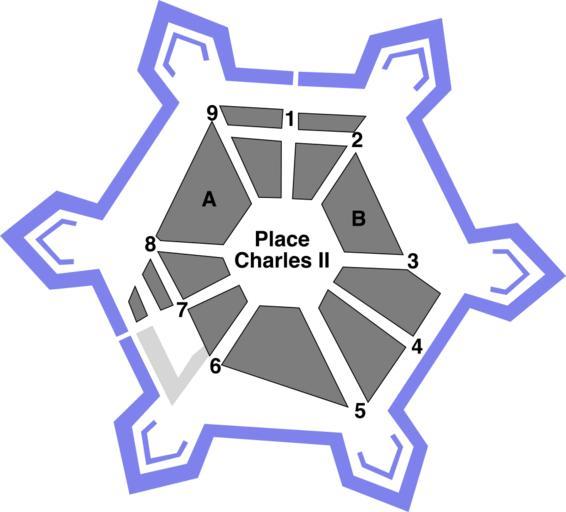 | Keywords: Place Charles II (Charleroi).svg En bleu la forteresse de 1666 aujourd'hui détruite 1 - Rue Neuve 2 - Rue de la Régence 3 - Rue Vauban 4 - Rue du Gouvernement 5 - Rue d'Orléans 6 - Rue de la Montagne 7 - Rue de France 8 - Rue de Turenne 9 - Rue du Dauphin A - Hôtel de Ville B - Église Saint-Christophe Maps of Charleroi |