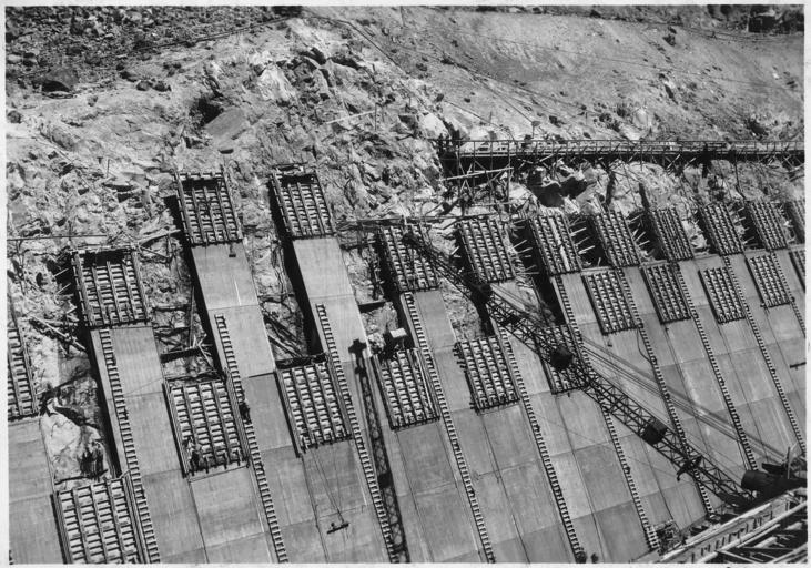 Keywords: Placing concrete in sidewall forms of Nevada spillway of Boulder Dam. Concrete is being handled by crane in 2-cubic... - NARA - 293885.jpg Scope and content Photograph from Volume Two of a series of photo albums documenting the construction of Hoover Dam Boulder City Nevada General notes 293885 Local identifier Department of the Interior Bureau of Reclamation Engineering and Research Center 05/18/1981 - 03/04/1988 NARA's Rocky Mountain Region Denver NRGA Building 48 Denver Federal Center West 6th Avenue and Kipling Street Denver CO 80225-0307 1933-06-10 Record group Record Group 115 Records of the Bureau of Reclamation 1889 - 2008 Record group ARC 444 Photograph albums compiled 1903 - 1972 Series ARC 293611 File unit File unit ARC Variant control numbers NAIL Control Number NRG-115-CONSTPHO85006-BC21759 Other versions <gallery> File Placing concrete in sidewall forms of Nevada spillway of Boulder Dam Concrete is being handled by crane in 2-cubic - NARA - 293885 tif tif </gallery> NARA-cooperation PD-USGov Construction of the Hoover Dam |