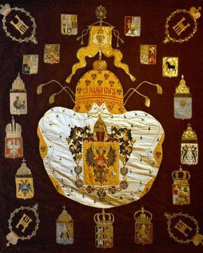 Keywords: Plafond of suspended coronation canopy (1896, Kremlin).jpg Плафон от подвесного ко онационного балдахина Россия 1896 г Ба хат атлас глазет золотный шну блестки фольга золотные и шелковые нити металл; ткачество шитье аппликация Плафон от подвесного или висячего балдахина в Успенском собо е был создан к ко онации импе ато а иколая II и импе ат ицы Александ ы Федо овны По т адиции ведущей свое начало с ко онации 1724 г он выполнен из малинового ба хата; в цент е его помещен ге б Российской импе ии выполненный в технике аппликации а по углам вензели импе ато а в ок ужении цепи о дена Святого Анд ея Пе возванного Элементы ге ба выполнены из глазета и азноцветного атласа и вышиты с использованием фольги золотными и шелковыми нитями и блестками Все золотошвейные аботы были выполнены монахинями т ех московских монасты ей Вознесенского оводевичьего и Алексеевского http //www kreml ru/exhibitions/virtual-exhibitions koronatsii-v-moskovskom-kremle/koronatsiya-nikolaya-ii/ 1896 монахини т ех московских монасты ей - Вознесенского оводевичьего и Алексеевского Coronations Kremlin exhibition 2013 Files uploaded by Shakko from various sources 1896 works Coronation of Nicholas II of Russia Textiles in the Museums of Moscow Kremlin Coats of arms of the Russian empire PD-old