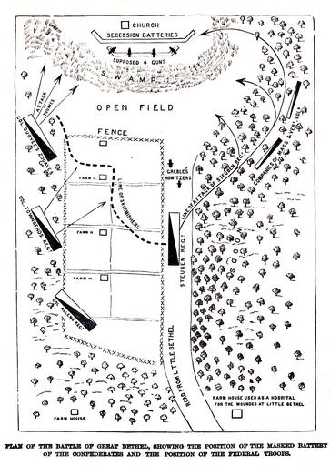 | Keywords: cartoon sketch drawing text illustration photo border Showing the Position of the Masked Battery of the Confederates and the position of the Federal Troops. (from Frank Leslie's Illustrated History of the Civil War..., edited by Louis Shepheard Moat, Published by Mrs. Frank Leslie,New York, 1895)   The Battle of Big Bethel was one of the earliest land battles of the American Civil War. It took place on the Virginia Peninsula, near Newport News, on June 10, 1861.  The Virginia State government had refused President Abraham Lincoln’s appeal for troops to put down the rebellion of the southern states, and its decision to secede from the Union was ratified by popular vote on May 23, 1861. Confederate Colonel (later Major General) John B. Magruder was sent down the peninsula to deter any advance on the state capital Richmond by Union troops based at the well-defended post of Fort Monroe. This garrison was commanded by Major General Benjamin Butler, a former Massachusetts lawyer and politician, who established a new camp at nearby Hampton and another at Newport News. Magruder had also established two camps, within range of the Union lines, at Big Bethel and Little Bethel, as a lure to draw his opponent into a premature action.  Butler took the bait, when he and an aide, Major Theodore Winthrop, devised a plan for a dawn attack on June 10, 1861, after a night march to drive the Confederates back from their bases. Butler chose not to lead the force in person, for which he was later criticized. The plan proved too complex for his poorly-trained subordinates to carry out, especially at night, and his staff had also omitted to communicate the passwords. They were trying to advance without knowledge of the layout or strength of the Confederate positions, when a friendly fire incident gave away their own. The commander in the field, Massachusetts militia general Ebenezer Peirce, received the most criticism for the failed operation.  The Union forces suffered 76 casualties, with 18 killed, including Major Winthrop and Lieutenant John T. Greble, the first regular army officer killed in the war. The Confederates suffered only 8 casualties, with 1 killed. Although Magruder subsequently withdrew to Yorktown and his defensive line along the Warwick River, he had won a propaganda victory and local Union forces attempted no further significant advance until the Peninsula Campaign of 1862. While small in comparison to many later battles, Big Bethel attracted considerable press coverage and exaggerated importance because of the newness of the war and the general feeling the war would be short.  The engagement was also known as the Battle of Bethel Church or Great Bethel.  Read more at en.wikipedia.org/wiki/Battle_of_Big_Bethel Showing the Position of the Masked Battery of the Confederates and the position of the Federal Troops. (from Frank Leslie's Illustrated History of the Civil War..., edited by Louis Shepheard Moat, Published by Mrs. Frank Leslie,New York, 1895)   The Battle of Big Bethel was one of the earliest land battles of the American Civil War. It took place on the Virginia Peninsula, near Newport News, on June 10, 1861.  The Virginia State government had refused President Abraham Lincoln’s appeal for troops to put down the rebellion of the southern states, and its decision to secede from the Union was ratified by popular vote on May 23, 1861. Confederate Colonel (later Major General) John B. Magruder was sent down the peninsula to deter any advance on the state capital Richmond by Union troops based at the well-defended post of Fort Monroe. This garrison was commanded by Major General Benjamin Butler, a former Massachusetts lawyer and politician, who established a new camp at nearby Hampton and another at Newport News. Magruder had also established two camps, within range of the Union lines, at Big Bethel and Little Bethel, as a lure to draw his opponent into a premature action.  Butler took the bait, when he and an aide, Major Theodore Winthrop, devised a plan for a dawn attack on June 10, 1861, after a night march to drive the Confederates back from their bases. Butler chose not to lead the force in person, for which he was later criticized. The plan proved too complex for his poorly-trained subordinates to carry out, especially at night, and his staff had also omitted to communicate the passwords. They were trying to advance without knowledge of the layout or strength of the Confederate positions, when a friendly fire incident gave away their own. The commander in the field, Massachusetts militia general Ebenezer Peirce, received the most criticism for the failed operation.  The Union forces suffered 76 casualties, with 18 killed, including Major Winthrop and Lieutenant John T. Greble, the first regular army officer killed in the war. The Confederates suffered only 8 casualties, with 1 killed. Although Magruder subsequently withdrew to Yorktown and his defensive line along the Warwick River, he had won a propaganda victory and local Union forces attempted no further significant advance until the Peninsula Campaign of 1862. While small in comparison to many later battles, Big Bethel attracted considerable press coverage and exaggerated importance because of the newness of the war and the general feeling the war would be short.  The engagement was also known as the Battle of Bethel Church or Great Bethel.  Read more at en.wikipedia.org/wiki/Battle_of_Big_Bethel |