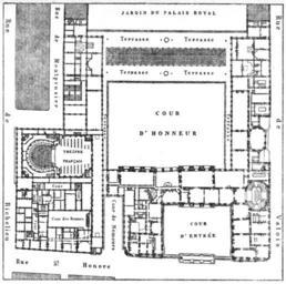 Keywords: Plan du premier étage du Palais-Royal après sa restauration par Fontaine 1833 - Espezel 1936 p201 (adjusted).jpg Palais-Royal in Paris after its restoration in 1833 to designs by Pierre-François-Léonard Fontaine in which the support facilities of the Théâtre-Français were enlarged including the addition of the Cour des Remises ; new galleries with terraces around the Cour d'Honneur were added; and the Galerie d'Orléans between the court and the garden was glazed Plan du premier étage du Palais-Royal après sa restauration par Fontaine 1833 - Espezel 1936 p201 jpg The image was rotated 90 degrees to the right and cropped to remove the caption architect 1781 Creator Victor Louis architect 1833 Creator Pierre-François-Léonard Fontaine 1833 Plans of the Palais-Royal 1833 Pierre François Léonard Fontaine PD-old-100 |