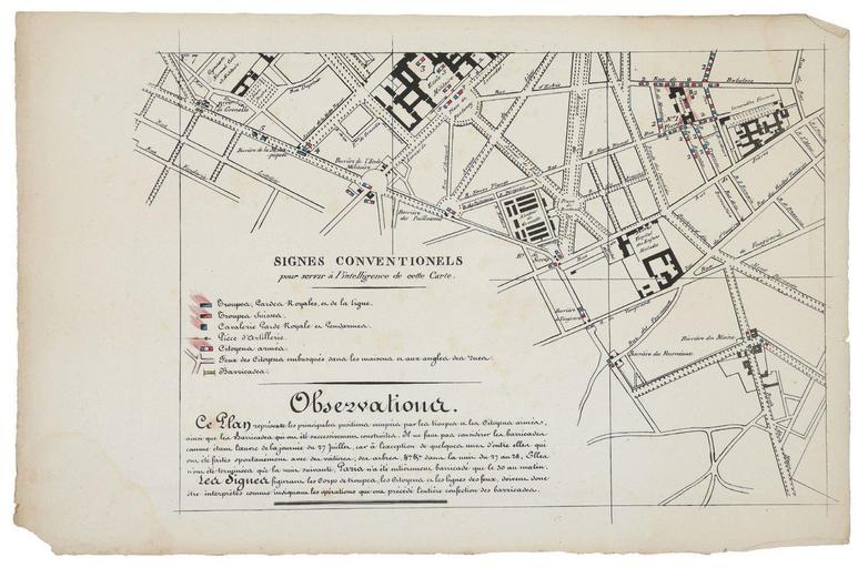 | Keywords: Plan figuratif des barricades et des positions et mouvements des citoyens armés et des troupes pendant les journées des 27, 28, et 29 juillet 1830.jpg Map http //www pba-auctions com/html/fiche jsp id 2719849 np 1 lng fr npp 20 ordre aff r Pierre Bergé et associés vente collection Jean-Pierre Faur 1830 Charles Motte Maps PD-old-100-1923 | ||||