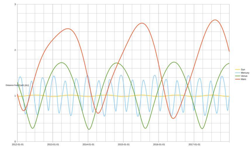 | Keywords: Planet distances.svg en The distances in AU between Earth and the other inner planets and the Sun for 2012 “2017 Created with LibreOffice Calc using data from http //www fourmilab ch/solar/solar html 2014-11-12 own Jao other versions cc-zero Uploaded with UploadWizard Uncategorized 2014 November 12 |