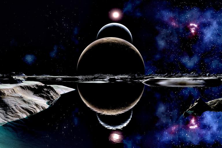 Keywords: planet sky lake landscape sun water reflection space star space art rock water infinity distant wanderlust science fiction back light cosmic fog cosmos cosmic sacral holy universe forever eternity contrast artmatic voyager alien skies of thick scherzinger