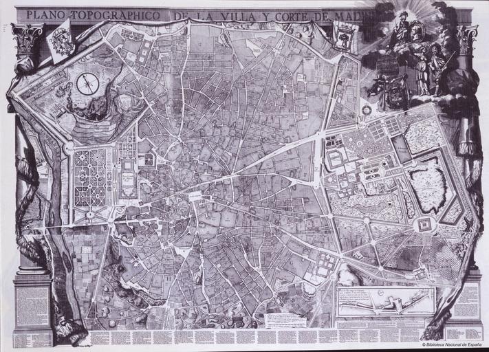 Keywords: Plano de Madrid-Espinosa-1769.jpg es Mapa de Antonio Espinosa de los Monteros 1769 ; digitalizado por la Biblioteca Nacional de España Ficha de información con texto de Félix Boix En el año 1769 D Antonio Espinosa de los Monteros y AbadÃa individuo de la Real Academia de San Fernando dibujó y grabó por orden del Conde de Aranda un gran plano de Madrid dividido en nueve hojas y en escala de 1 por 1 900 aproximadamente que dedicó al referido Ministro y en el que se representaron las obras entonces en construcción y hasta alguna de las proyectadas Para la formación de este plano se tuvieron presentes los minuciosos trabajos realizados en cumplimiento de la Cédula Real que dispuso se hiciese la visita general para la RegalÃa de aposento labor que comenzada en l750 y repetida en l766 llevaron a cabo cuatro arquitectos bajo la dirección de D Nicolás de Churriguera por quien están autorizados los planos de las 557 manzanas en escala de 1 por 300 a las que entonces se dió numeración que por primera vez aparece en el plano de Espinosa 1769 Servicio de cartografÃa del Ministerio de Fomento del Estado Español Biblioteca Nacional de España https //alfonsopinel files wordpress com/2013/07/mv13-11 jpg Fuente de la copia digitalizada Dibujado y grabado por Creator Antonio Espinosa de los Monteros 1732 “1812 PD-Scan PD-old-auto-1923 1812 Plano topográphico de la Villa y Corte de Madrid al Excmo Sr Conde de Aranda Capitán General de los Exércitos y Presidente del Consejo de Antonio Espinosa de los Monteros jpg Antonio Espinosa's Plano topographico de la Villa y Corte de Madrid 1769 |