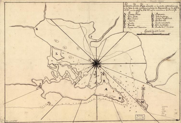 Keywords: Plano de Puerto Rico, situado en la parte septemtrional de la ysla de este nombre, una de las de Barlovento en la lattd. de 18035ʹ y en la longd. de 310038ʹ segn. el meridiano de Thenerife.jpg en Shows vicinity of San Juan including fort and harbor - Depths shown by soundings - Prime meridian Tenerife - Oriented with north to the bottom - Pen-and-ink - Mounted on cloth backing - LC Luso-Hispanic World 768 - Available also through the Library of Congress Web site as a raster image - Indexed - Maggs number annotated in pencil in lower right corner 318 - Vault Medium 1 map ms ; 32 x 47 cm Call Number G4974 S5 1780 P5 Repository Library of Congress Geography and Map Division Washington D C 20540-4650 USA dcu Digital Id http //hdl loc gov/loc gmd/g4974s lh000768 Library of Congress Catalog Number 90683895 Other Formats - MARCXML Record - MODS Record - Dublin Core Record Catalog Record http //lccn loc gov/90683895 1780 Library of Congress http //www loc gov/item/90683895/ author other versions PD-USGov San Juan Puerto Rico Maps of Puerto Rico Maps of San Juan Puerto Rico San Juan Bay Puerto Rico Uploaded with UploadWizard