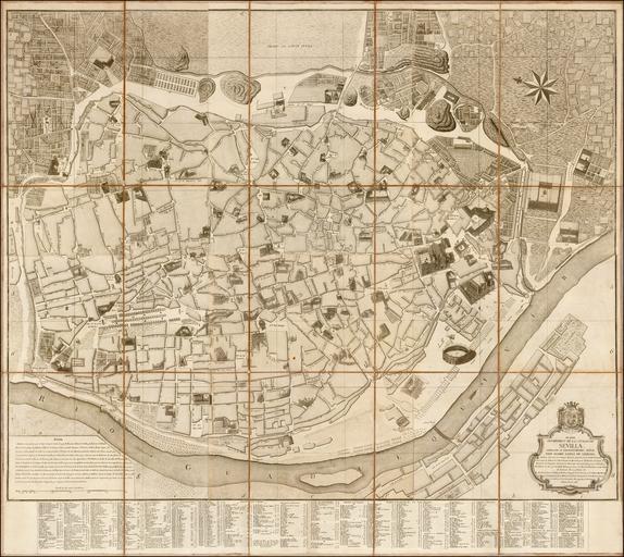 Keywords: Plano Geométrico De La Ciudad De Sevilla, por Juan López.jpg en Finely executed large format plan of Sevilla publshed by Spain's leading mapmaker of the late 18th Century Juan Lopez The map provides an exceptionally detailed look at Sevill'a old town including dozens of profile views of major buildings which are located in the key below the map The map pre-dates by 12 years the yellow fever epidemic which killed nearly a third of Sevilla's population Sevilla has been one of the most important cities in Spain since ancient times The first settlers of the site have been identified with the Tartessian culture The destruction of their settlement is attributed to the Carthaginians giving way to the emergence of the Roman city of Hispalis built very near the Roman colony of Itálica now Santiponce which was only 5 miles northwest of modern Sevilla Under Muslim rule the city became the seat of power in the Caliphate of Cordoba Following the reconquest of Spain from the Moors in 1248 Sevilla became one of the Capital cities of Spain 1788 cm 108 87 6 accession number object history credit line https //www raremaps com/gallery/detail/39455/Plano_Geometrico_De_La_Ciudad_De_Sevilla_Dedicado_al_Excelentisimo_Senor/Lopez html www raremaps com PD-old-100 Old maps of Seville |