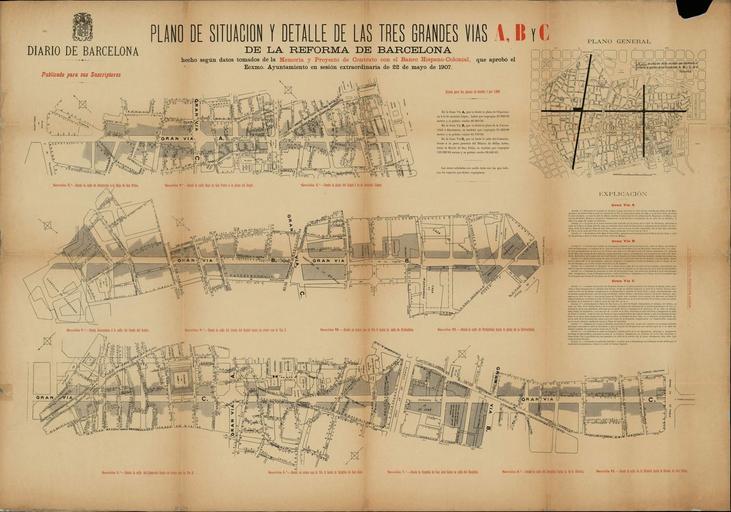 Keywords: Plano tres grandes vías (1907).jpg es Plano de situación y detalle de las tres grandes vías A B y C Diario de Barcelona 1907 http //4 bp blogspot com/-D229ahrF3Tc/TxWyApXaUrI/AAAAAAAAF_E/D3jJ8WcXsEo/s1600/1907_grans-vies-abc jpg author 1907 Maps of the history of Barcelona PD-old |