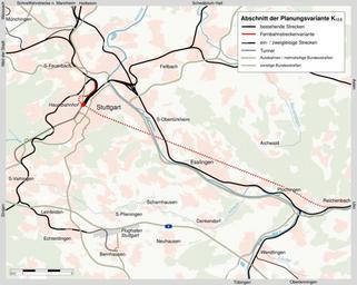 | Keywords: Planungsvariante K12-5.png en A map of the variant K 12 5 for a Stuttgart-Ulm high-speed railway line A ~20 km tunnel between Stuttgart and the area of Plochingen with a four-track station underneath a 16-track terminus to be kept was a key element of this variant While only the greater Stuttgart area is depicted on the map this line would have continued to Ulm The route is derived from the plans for the official approval process The underlying map is based on Karte_Stuttgart_21_aussen_Kartenwerkstatt svg a public domain map by K Jähne kjunix <br />While existing rail lines are depicted in black the new high-speed line is in red Dotted lines are used for tunnels de Karte zur nicht realisierten Planungsvariante K 12 5 für eine Schnellfahrstrecke zwischen Stuttgart und dem Raum Ulm Dargestellt ist der Großraum Stuttgart mit dem Fernbahntunnel Stuttgart gestrichelt der bis Ulm führenden Strecke Die Informationen stammen aus den Planfestellungsunterlagen zur Ausbau- und Neubaustrecke Stuttgart-Augsburg Teil B Bereich Kirchheim-Weilheim-Aichelberg von 1997 Die Karte basiert auf der gemeinfreien Datei Karte_Stuttgart_21_aussen_Kartenwerkstatt svg von K Jähne kjunix own Stoeffler 2011-04-22 Cc-zero Maps of project Stuttgart 21 |