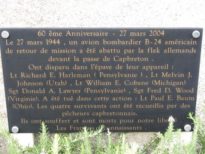 | Keywords: Plaque B-24 Capbreton.jpg en Plaque in Capbreton Landes France in memory of a US bomber B-24 shot down after a mission over Germany during WWII on march 27 1944 The text is On march 27th-1944 a US bomber B-24 back from a mission was shot down by german anti-aircraft artillery in front of Capbreton Disappeared in the crash Lt Richard E Perleman Pennsylvania Lt Melvin J Johnson Utah Lt William E Cobane Michigan Sgt Donald A Lawyer Pennsylvania Sgt Fred D Wood Virginia Was killed in this action Lt Paul E Baum Ohio 4 surviving soldiers were rescued by local sailors They suffered and died for our liberty The survivors were captured by german once ashore fr Plaque à Capbreton Landes en mémoire d'un bombardier US B-24 abattu au retour d'une mission sur la base aérienne de Mont-de-Marsan pendant la Seconde Guerre Mondiale le 27/3/1944 Touché par la flak peu après le bombardement il avait essayé de rejoindre l'Espagne mais volant trop bas il fut abattu par l'artillerie cotière de Capbreton Les 4 survivants recueillis par les pêcheurs capbretonnais furent faits prisonniers par les allemands à leur arrivée à terre own Tangopaso 2011-10-20 12 03 06 43 654163 -1 440722 region FR_heading NW Capbreton Plaques in Landes Plaques referencing 1944 in France B-24 Liberator in art |