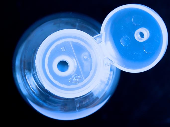 Keywords: plastic bottle transparent light blue lid open