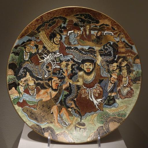 | Keywords: Plate, Japan (Kyoto), Choshuzan workshop, decorated by Jissei after a design by Yoshisada, undated, earthenware with overglaze, gold, and white enamel - Chazen Museum of Art - DSC02418.JPG en Exhibit in the Chazen Museum of Art University of Wisconsin-Madison Madison Wisconsin USA This artwork is old enough so that it is in the public domain Photography was permitted in the museum without restriction 2013-07-21 14 04 47 own Daderot cc-zero Ceramics of Japan in the Chazen Museum of Art Uploaded with UploadWizard Choshuzan ware |