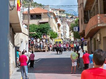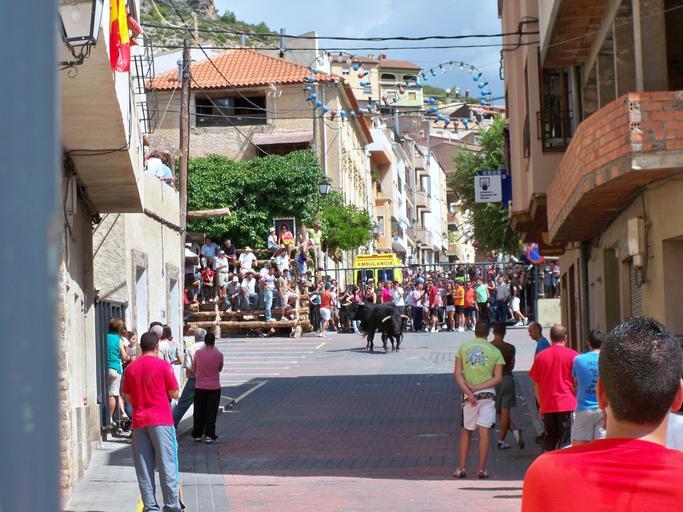 Keywords: Plaza del Carmen en fiestas.JPG es Plaza de Nuestra Señora del Carmen de Molinicos durante un encierro own Siempremolinicos Visitor attractions in Spain Molinicos Holidays in Spain Running of the Bulls in Spain Fiestas patronales in Spain