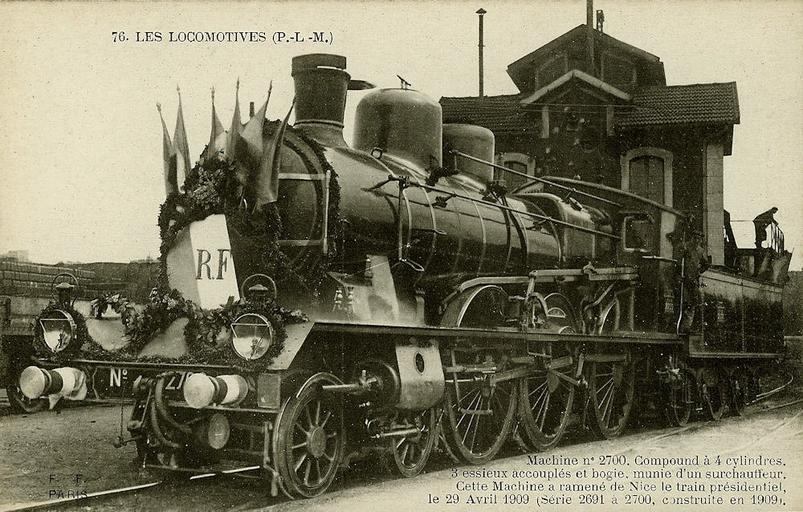 Keywords: PLM 230 2691-2700.jpg en Presidential train leaded by PLM 4-6-0 2700 in 1909 fr Locomotive compound PLM 230 2700 en tête d'un train présidentiel en 1909 2012-10-03 postcard Fernand Fleury 1918-07-18 Custom license marker 2012 10 05 PD-old-80 Uploaded with UploadWizard Postcards of steam locomotives in France Steam locomotives of the Compagnie des chemins de fer de Paris à Lyon et à la Méditerranée Photographs by Fernand Fleury |