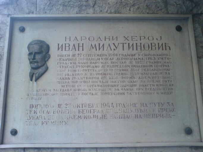 | Keywords: Ploca Ivan Milutinovic 1.JPG en Monument of Ivan Milutinovic in Belgrade sr Спомен плоча Ивану Рилутиновићу у Ð‘ÐµÐ¾Ð³Ñ Ð°Ð´Ñƒ Own Pinki a k a Pinki heroj Ivan Milutinović Monuments to the People's Heroes of Yugoslavia |