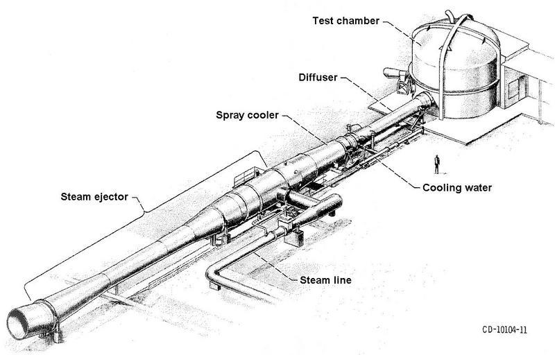 | Keywords: blackandwhite monochrome drawing text sketch black and white (CD-10104-11): This drawing details the 150-foot-long diffuser, cooler, and steam ejector assembly that exhausts the HTF’s test gas while simulating altitudes as high as 120,000 feet in the test chamber. Steam is supplied by one of the center’s boiler houses through a 30-inch pipe. (CD-10104-11): This drawing details the 150-foot-long diffuser, cooler, and steam ejector assembly that exhausts the HTF’s test gas while simulating altitudes as high as 120,000 feet in the test chamber. Steam is supplied by one of the center’s boiler houses through a 30-inch pipe. |